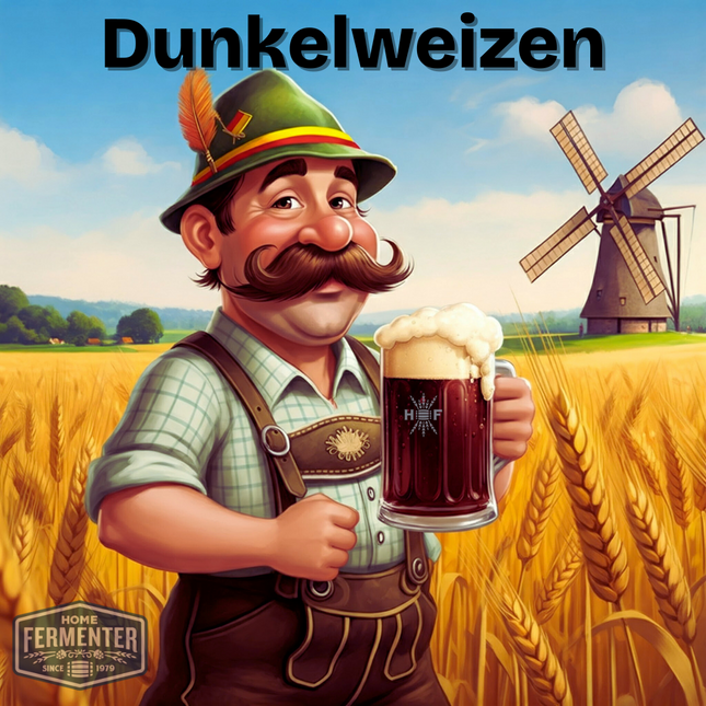 Experience the rich flavors of a traditional German wheat beer with our Dunkelweizen - Extract with Grains Kit. Bursting with notes of ripe banana and aromatic clove, this copper-brown beer boasts a velvety smooth texture and a refreshing, crisp finish. Perfect for the adventurous beer lover looking for a unique and flavorful experience!  Each kit includes high-quality malt extract, specialty grains, and hops. With step-by-step instructions included, you'll be guided through the brewing process, ensuring a smooth and successful batch every time. Our recipe kits include steeping muslin socks for grain and boiling hop additions. Yeast and priming sugar are not included in the kit and are optional add-on items.  Estimated Beer Stats LME Option DME Option Original Gravity (OG) 1.055 1.055 Final Gravity (FG) 1.015 1.015 Approximate ABV 5.3% 5.3% Color (SRM) 19 19 Bitterness (IBUs) 14 14 Ingredient / Instruction Sheet   *YEAST SOLD SEPARATELY*  Recommended yeasts are: Wyeast 3068 Weihenstephan Weizen, Imperial G01 Stefon, Lallemand Munich Classic, Safbrew WB-06 or Mangrove Jack's M20 Bavarian Wheat. Makes 5 Gallons