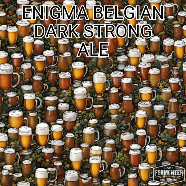 Introducing Enigma, a Belgian Dark Strong Ale recipe kit that allows you to craft a rich, full-bodied beer with deep amber to copper-brown hues. This brew features complex malt flavors reminiscent of toasted bread and caramel, complemented by dark fruit notes like raisin and plum, and a subtle spiciness from noble hops. With an estimated ABV of 8.5% and an IBU of 24, Enigma offers a smooth mouthfeel with noticeable alcohol warmth, making it a perfect choice for those seeking a complex and rewarding homebrewing experience. Our recipe kits include steeping muslin socks for grain and hop additions. Yeast and priming sugar are not included in the kit and are optional add-on items. Makes 5 Gallons.  Estimated Beer Stats LME Option DME Option Original Gravity (OG) 1.077 1.088 Final Gravity (FG) 1.012 1.013 Approximate ABV 8.5% 8.8% Color (SRM) 13 12 Bitterness (IBUs) 24 26 Ingredient / Instruction Sheet