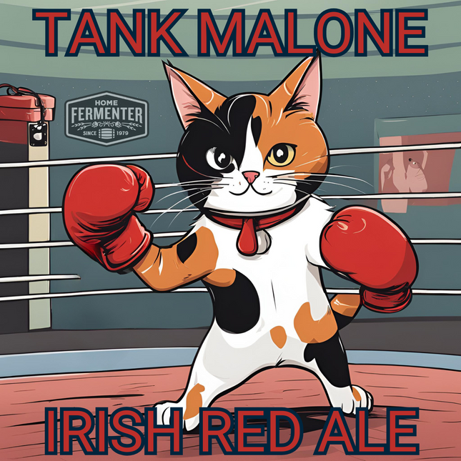 If malty brews are your jam, then this Irish Red Ale is a must-try. This malt bomb is sure to pack a punch! Our Tank Malone Irish Red extract recipe kit - a malt forward beer that has a deep red/copper hue. Crafted for both novice home brewers and seasoned enthusiasts, this kit contains all the premium ingredients you need to create a rich and flavorful Irish Red ale right in the comfort of your own home. Our recipe kits include steeping muslin socks for grain and hop additions. Yeast and priming sugar are not included in the kit and are optional add-on items. Makes 5 Gallons.  Estimated Beer Stats LME Option DME Option Original Gravity (OG) 1.046 1.054 Final Gravity (FG) 1.011 1.012 Approximate ABV 4.7% 5.4% Color (SRM) 14 15 Bitterness (IBUs) 22 20 Ingredient / Instruction Sheet