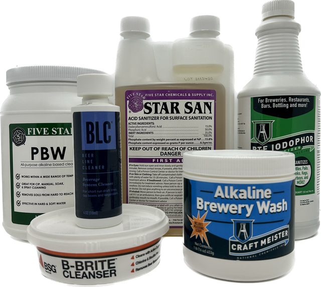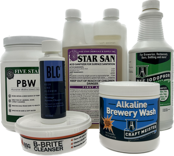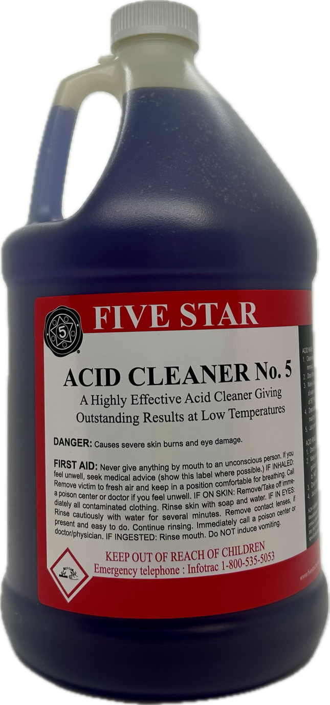 Five Star Chemical's Acid #5 cleaner with a blend of nitric and phosphoric acids with low-foaming surfactants for stone/protein removal. Please Note: Hazardous Material; does not ship. For store pick-up only. Key Features: Specially formulated to passivate and re-passivate stainlesssteel. Low-foaming designed to attack beer stone and scale. Safety Precautions: Causes severe skin burns and eye damage Do not breathe fume, mist, or spray. Wear protective gloves and eve protection Wash hands and forearms thoroughly after handling Store locked up. Dispose of contents/container in accordance with local regulations. Safety Data Sheet (SDS) Instructions: Acid Rinse Make solution of 1 oz. per 10 gallons of water. Circulate the solution for 15-20 minutes at a temperature of 50°-140°F Drain, rinse, and sanitize before use. Acid Wash Make solution of 1 oz. per 1 gallon of water. Circulate the solution for 15-20 minutes at a temperature of 50°-140°F Drain, rinse, and sanitize before use. Initial Acid Passivation After cleaning vessel, make a solution of 5 oz. of Acid #5 to 1 gallon of water. Circulate for 15-20 minutes at a temperature of 120°F. Drain vessel and ALLOW TO AIR DRY. Vessel must air dry in order to achieve successful passivation. After letting equipment air dry, rinse before sanitizing. Sanitize before use. Repassivation After cleaning vessel, make a solution of 1 oz. of Acid #5 to 1 gallon of water. Circulate for 30 minutes at a temperature of 120°F. Drain vessel and ALLOW TO AIR DRY. Vessel must air dry in order to achieve successful passivation. After letting equipment air dry, rinse before sanitizing. Sanitize before use