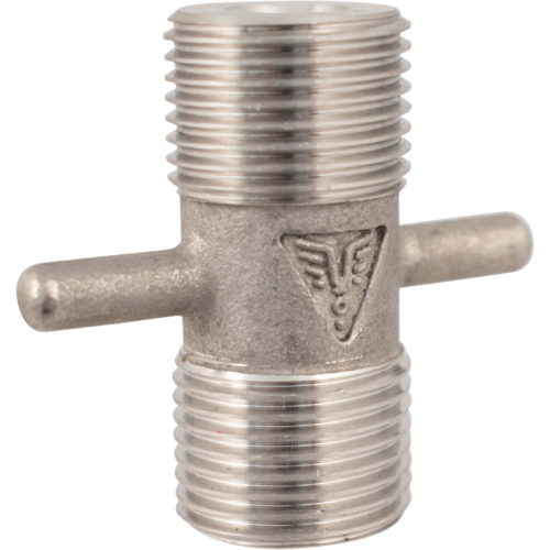 This stainless steel dual line flush adapter will work with D and S style couplers. This saves time by making it possible to flush two beer line systems at the same time. The integrated ball lifter in the center of both flushing cups lifts the check ball in the probes to allow easy flushing. Assembly made from Stainless Steel.