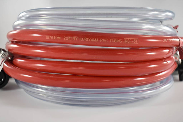 5/16" ID red or clear vinyl beverage and gas tubing. The red color is generally used for gas line. Accuflex Bevlex 200 PVC Tubing is used for draft beer transfer and BIB soft drink applications. Its special dual durometer construction combines a low extraction inner contact surface with a flexible outer layer to provide excellent kink resistance and taste protection. NSF-51 Listed. Inside Diameter (ID): 5/16" Outside Diameter (OD): 9/16" Clamp Size: 15.7mm or 17mm Prop 65 Warning: This product contains phthalates (DEHP, DBP, BBP), a chemical known to the State of California to cause cancer, birth defects and other reproductive harm.