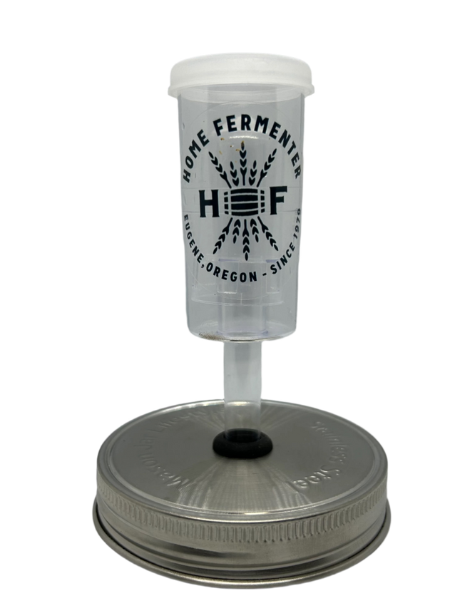 An one gallon glass fermenting jar with a grommeted plastic lid and a medium sized cylinder airlock.