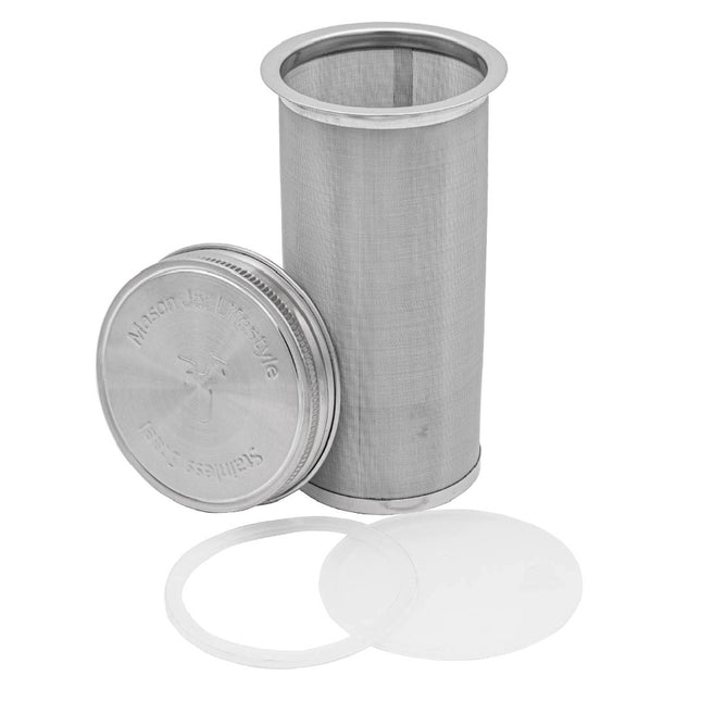 This system includes: --One heavy duty, very fine mesh, dutch weave stainless steel filter that fits a wide mouth (3″ internal diameter) Mason jar. --Two different silicone seals (use one at a time) --One wide mouth stainless steel lid to make everything leak proof and dishwasher safe. Use it to make cold brew coffee or iced coffee concentrate, hot or iced tea, nut milk, infused water or alcohol, or to filter or strain any liquid – all right in the jar! Scroll down for recipes. 2 sizes available to fit Wide Mouth Mason jars:  --Quart filter for 32oz or 24oz (Quart & Half) Wide Mouth jars --Half Gallon filter for 64oz Wide Mouth jars Use this filter system to make delicious cold brewed coffee and steep loose leaf tea for the perfect, smooth beverage any time of year! Coffee and tea made through this system is good for you and the environment.  Directions: For brewing and steeping: Only use the "wrap around" silicone seal that seals both sides of the metal filter (against glass and lid). This seal is optional if you keep the jar upright. Cold Brew Coffee - To make cold brew coffee concentrate, fill the filter tube about 3/4 full with coarse ground coffee, to allow for swelling. Pour in cold water to fill jar and allow it sit on your counter or in your fridge for 24 hours. Loose Leaf Tea - To steep loose leaf tea, combine 1-2 teaspoons of your favorite tea with 6-8 oz of cold water and place in fridge. Steep white or green tea for 6 to 8 hours; steep black or oolong tea for 8 to 12 hours depending on desired strength. Hot Coffee or Tea - You can also use this filter to make hot coffee and tea. Put the grounds or leaves in the filter, pour in 200 degree water, and wait a few minutes. Once brewing/steeping is complete, remove the filter, dump grounds/leaves into your compost, pour over ice, add your favorite coffee/tea additions and enjoy! For storing: Keep your brewed coffee and tea in your Mason jar fresh and leak proof with the other silicone seal and stainless steel lid included. Helpful tips: Be sure you use coarse ground coffee! A higher quality coffee grinder will give you a more consistent coarse grind. Cheaper grinders produce a mix of coarse all the way down to powdery grinds.  The cold brew coffee concentrate will be strong, so you may need to dilute it. Serve it hot or over ice, add sugar or dairy, or any other way you like! To make a more concentrated version, use more coffee grounds or steep for longer. Cold brew coffee is commonly made very strong and diluted at serving time. They are 10cm, 15cm, and 21cm tall. The mesh part is 7cm in diameter. The mesh is 50 micron dutch weave. All parts are dishwasher safe, and I find this the easiest way to clean them.