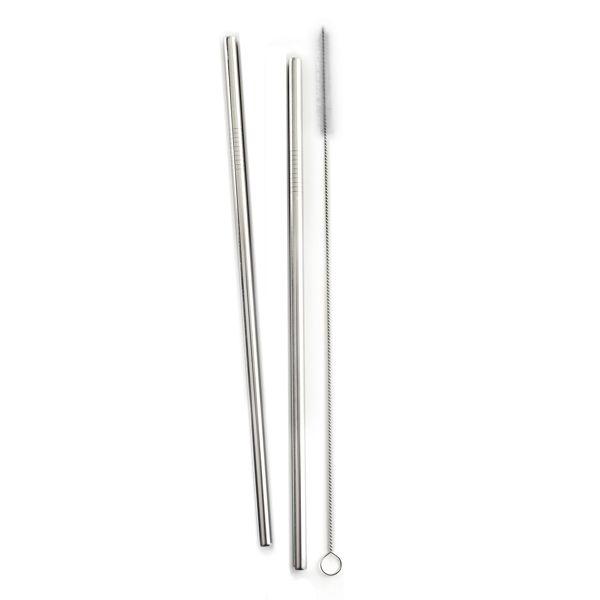 Set of two stainless steel drinking straws with cleaning brush. Specifications: Straws measure: 11" x .315" x .315" / 28cm x .8cm x .8cm Flexible brush is made to fit the full length of the straw:  12" / 30.5cm Fits 24-30 oz tumblers. Use with your favorite cups and travel mugs. Use for cocktails, smoothies, shakes, sodas, water, juices, coffee or tea, hot or cold. Dishwasher safe.