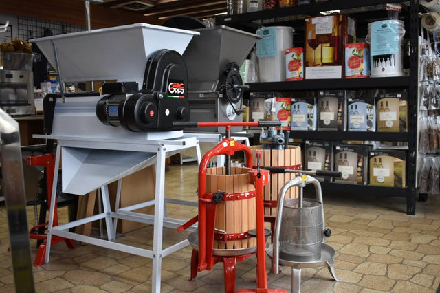 Does not ship, for In-Store Pickup only. This item is 24 amps. Make sure you have the correct power requirements. A motorized shredder for use with apples, pears or any other fruit which needs processing before it can be pressed for its juice. Not for use with peaches, cherries or other pitted fruits. To use, fruit is fed into the hopper at the top of the machine, where it falls on to spinner cutter blades which shred the fruit. The mash is then pushed out of the machine and into your waiting bucket where it can then be transferred to the press. Extremely simple to operate, and safe since the cutting blades are buried deep in the machine during operation. Sturdy, all stainless steel construction means that you know this machine will last you for years and years. Simple disassembly for cleaning. Runs on 110V power at 24 amps with a 2.8HP Motor. Made in Italy.