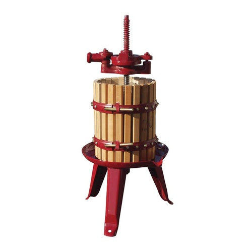 Great for pressing the juice from soft fruits (pitted peaches, apricots, etc.) or when used in conjunction with an apple crusher to make cider. The basket is made from perforated stainless steel. The press mechanism is a single wooden plate that pushes down via a threaded shaft that is connected to a t-handle. The entire pressing mechanism is hinged and folds out of the way when done, allowing for easy removal of spent fruit solids. Much faster than a typical wine press. This 20 cm Diameter basket holds 9.5L (2.5 Gallons) at a time. Made in Italy.