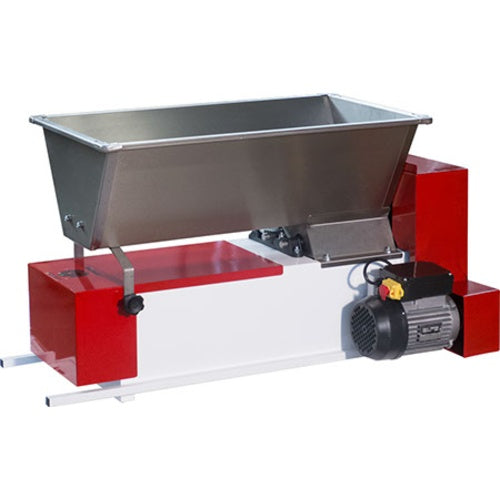 Does not ship, for In-Store Pickup only. Partially Stainless Motorized Crusher Destemmer with spring loaded, adjustable rubber rollers. Rubber rollers are preferred for a gentler crush. Rollers are spring loaded to allow/protect for the passing of hard item like a rock. They do offer a degree of adjustabiliy, however no hobby model crusher destemmer will allow rollers to be separated far enough to not crush the grapes. These types of crusher destemmers must be fed grapes in a systematic way. Overloading the hopper will bog down the machine. Internal sainless grate slides out for easy cleaning. The Crusher/Destemmer can be purchased by itself or alongside the Stainless Stand & Chute. Features: 304-Type Stainless Steel Receiving Bin, Screw Feed, and Destemming Basket. Enamel body. A Screw Feed drive receiving bin for continual, faster, hands-free operation Adjustabe Rubber Rollers (adjustment on all small machines, regardless of make, is limited to 5mm because of the way the gears mesh.) A powerful 110V 1HP motor which provides an hourly production of approximately 3000 lbs. Replacement parts are available Big, Red Emergency stop button on motor shuts down the machine in a hurry to help reduce chance of accident Overall dimensions: 47" long x 19.6" wide x 25" high. Weight: 118 pounds (54KG.) Imported from Italy from Enoitalia.