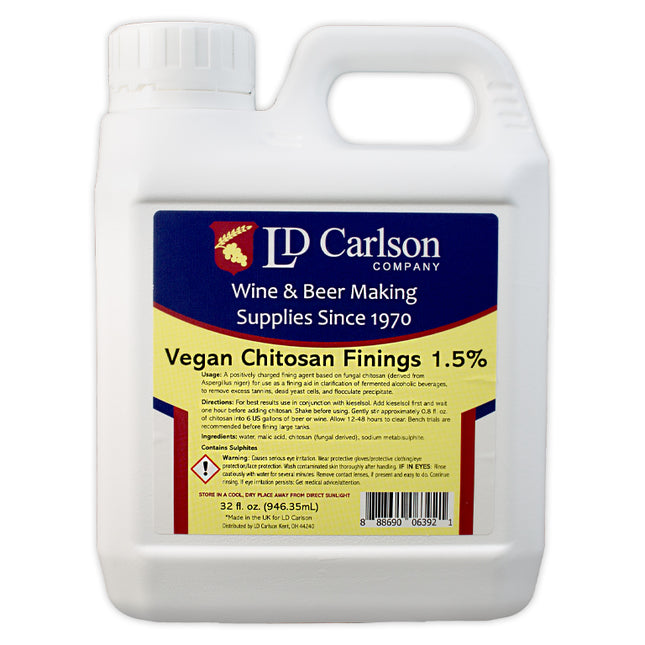 Chitosan 1% solution is a positively charged fining agent used to remove excess tannin, dead yeast cells and floccular precipitate. 1 liter (33.8 fl.oz) Directions: Gently stir into wine, beer or alco-base at the rate of 150-200mL/HL (1.5-2 U.S.Gal/1000 U.S.Gal). For best results use in conjunction with LiquorQuik® Kieselsol (D1) or liquid gelatine. Allow 12-48 hours to clear. Bench trials are recommended. Contains: Water, chitosan (Shellfish derivative), acetic acid