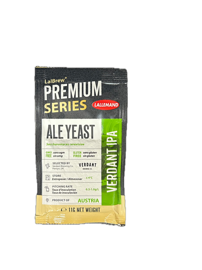 LALBREW® VERDANT IPA LalBrew® Verdant IPA was specially selected in collaboration with Verdant Brewing Co. (UK) for its ability to produce a variety of hop-forward and malty beers. Prominent notes of apricot and undertones of tropical fruit and citrus merge seamlessly with hop aromas. With medium-high attenuation, LalBrew® Verdant IPA leaves a soft and balanced malt profile with slightly more body than a typical American IPA yeast strain. This highly versatile strain is well suited for a variety of beer styles including NEIPA, English IPA, American Pale, English Bitter, Sweet Stout and Sours. QUICK FACTS Beer Styles:  NEIPA, English IPA, American Pale, English Bitter, Sweet Stout, Sours Aroma:  Apricot with notes of tropical fruit and citrus Attenuation:  Medium to High Fermentation Range:  18 - 23°C (64 - 73°F) Flocculation:  Moderate Alcohol Tolerance:  10% ABV Pitching Rate:  50-100g/hl to achieve a minimum of 2.5 - 5 million viable cells/ml BREWING PROPERTIES In Lallemand’s Standard Conditions Wort at 20°C (68°F) LalBrew® Verdant IPA yeast exhibits: Fermentation that can be completed in 5 days. Medium to high attenuation and moderate flocculation. Aroma and flavor is dominated by apricot with notes of tropical fruit and balanced malt character. The optimal temperature range for LalBrew® Verdant IPA yeast when producing traditional styles is 18°C (64°F) to 23°C (73°F). Lag phase, total fermentation time, attenuation and flavor are dependent on pitch rate, yeast handling, fermentation temperature and nutritional quality of the wort.  REHYDRATION Rehydration of LalBrew® Verdant IPA in sterile water is recommended prior to pitching into wort in order to reduce stress on the cell as it transitions from dry to liquid form. For many fermentations, this stress is not significant enough to affect fermentation performance and flavor, so good results may also be achieved when pitching dry yeast directly into wort. We highly recommend rehydration in harsher fermentation conditions such as high gravity or sour wort where the added stress of dry-pitching is more likely to have a greater impact on the finished beer. Use of a rehydration nutrient such as Go-Ferm Protect Evolution has been shown to improve fermentation performance for difficult fermentations. Rehydration guidelines are quite simple and present a much lower risk of contamination than a starter, which is unnecessary when using the recommended pitch rate of dried active yeast. Sprinkle the yeast on the surface of 10 times its weight in clean, sterilized water at 30-35°C (86-95F). Do not use wort, or distilled or reverse osmosis water, as loss in viability may result. Stir gently, leave undisturbed for 15 minutes, then stir to suspend yeast completely. Leave it to rest for 5 more minutes at 30-35°C. Without delay, adjust the temperature to that of the wort by mixing aliquots of wort with the rehydrated yeast. Wort should be added in 5 minute intervals and taking care not to lower the temperature by more than 10°C at a time. Temperature shock of >10°C will cause formation of petite mutants leading to extended or incomplete fermentation and possible formation of undesirable flavors. Do not allow attemperation to be carried out by natural heat loss. This will take too long and could result in loss of viability or vitality. Inoculate without delay into cooled wort in the fermenter. LalBrew® Verdant IPA yeast has been conditioned to survive rehydration. The yeast contains an adequate reserve of carbohydrates and unsaturated fatty acids to achieve active growth. It is unnecessary to aerate wort upon first use. STORAGE LalBrew® Verdant IPA yeast should be stored in a vacuum sealed package in dry conditions below 4°C (39°F). LalBrew® Verdant IPA will rapidly lose activity after exposure to air. Do not use 500g or 11g packs that have lost vacuum. Opened packs must be re-sealed, stored in dry conditions below 4°C (39°F), and used within 3 days. If the opened package is re-sealed under vacuum immediately after opening, yeast can be stored below 4°C (39°F) until the indicated expiry date. Do not use yeast after expiry date printed on the pack. Performance is guaranteed when stored correctly and before the expiry date. However, Lallemand dry brewing yeast is very robust and some strains can tolerate brief periods under sub-optimal conditions. 11g Pack