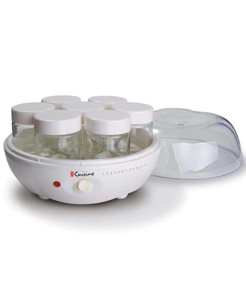 Enjoy your favorite flavor, made fresh at home with little fuss and preparation. The entire process takes between 6 to 10 hours. The yogurt maker includes seven 6-ounce glass jars with lids so you can make a different flavor in each! Timer on the side marks time when yogurt will be finished cooking. The unit has on/off switch and light indicating unit is working.