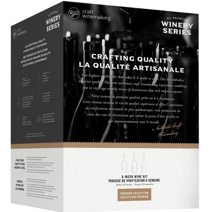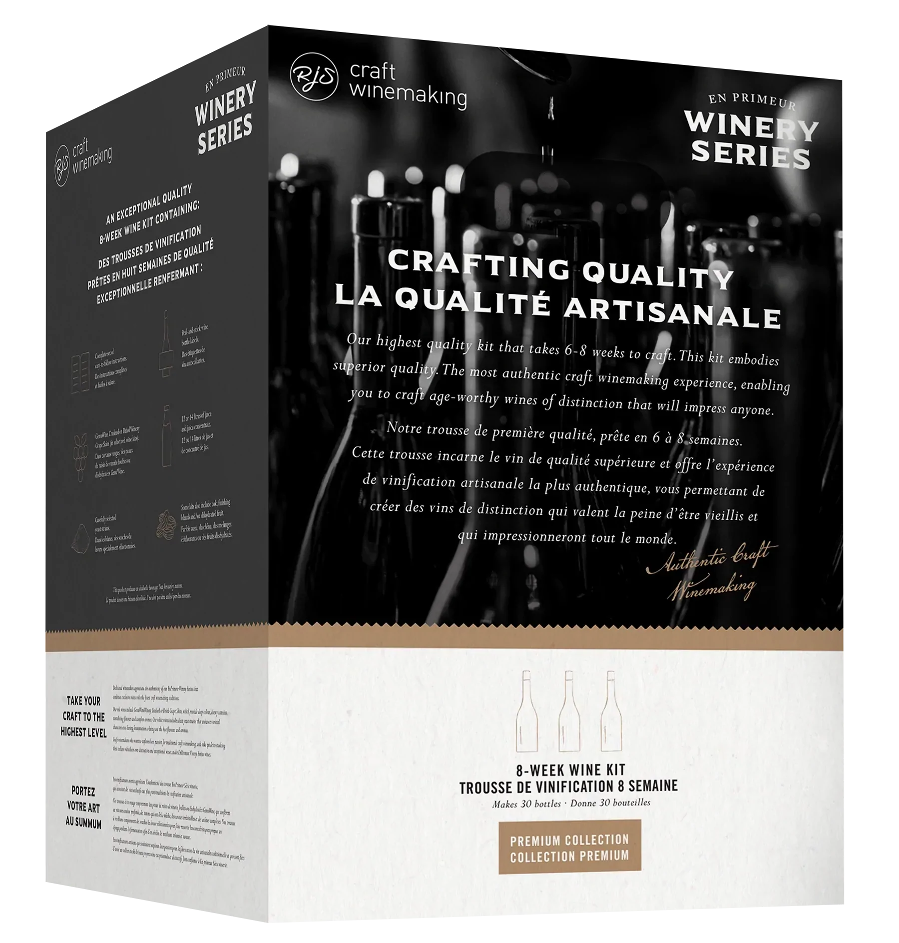 Each kit contains 16 or 18 liters of superior quality varietal grape juice and concentrate that, in as little as 6 to 8 weeks, will make 23 liters of your very own exceptional craft wine.